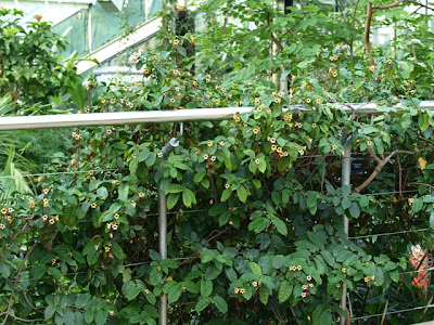 All the species of Strophanthus have them but Strophanthus preisii, the one in flower in the Conservatory now, has the longest, up to a foot long. (For Australian readers, a foot is found at the end of a Roman living in the British Isles around 1 AD and was reputedly about 30 centimetres long.) I couldn't get far enough away to fit them in but here you can see a few more inches more in this picture.