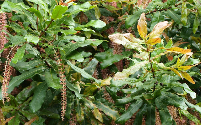 So for the new settlers, the hedge was easy to establish from freshly fallen fruit. Fittingly, perhaps, I have no pictures of the fruit, only the tangled thicket of branches and occasional trunk. This close up of some leaves reveals the lack of resolution in my pictures but it does show they are not unlike the Macadamia (in the picture following, taken in Royal Botanic Gardens Sydney a few years ago).